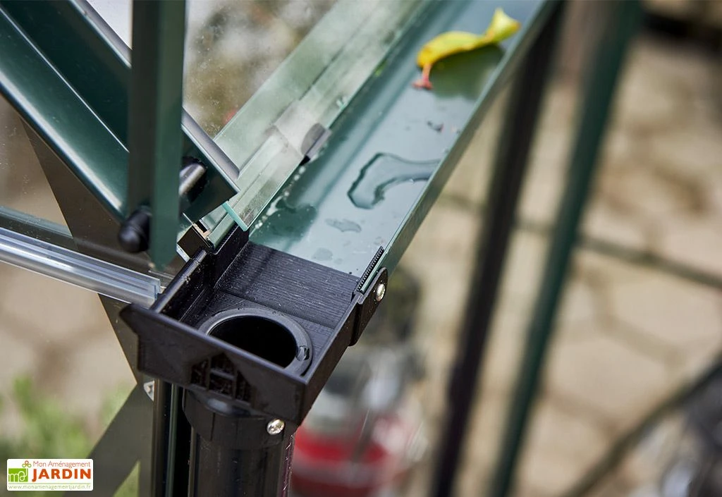 Afin de faciliter l’accès à l’intérieur de la serre, cette dernière s’est vue dotée d’une double porte coulissante de 122 cm de large. Quatre lucarnes de toit se chargeront pour leur part d’assurer la bonne ventilation de votre installation. Un système de gouttière communiquant avec l’intérieur de la serre permet même de collecter l’eau de pluie, vous permettant ainsi de la réutiliser pour l’arrosage de vos cultures.