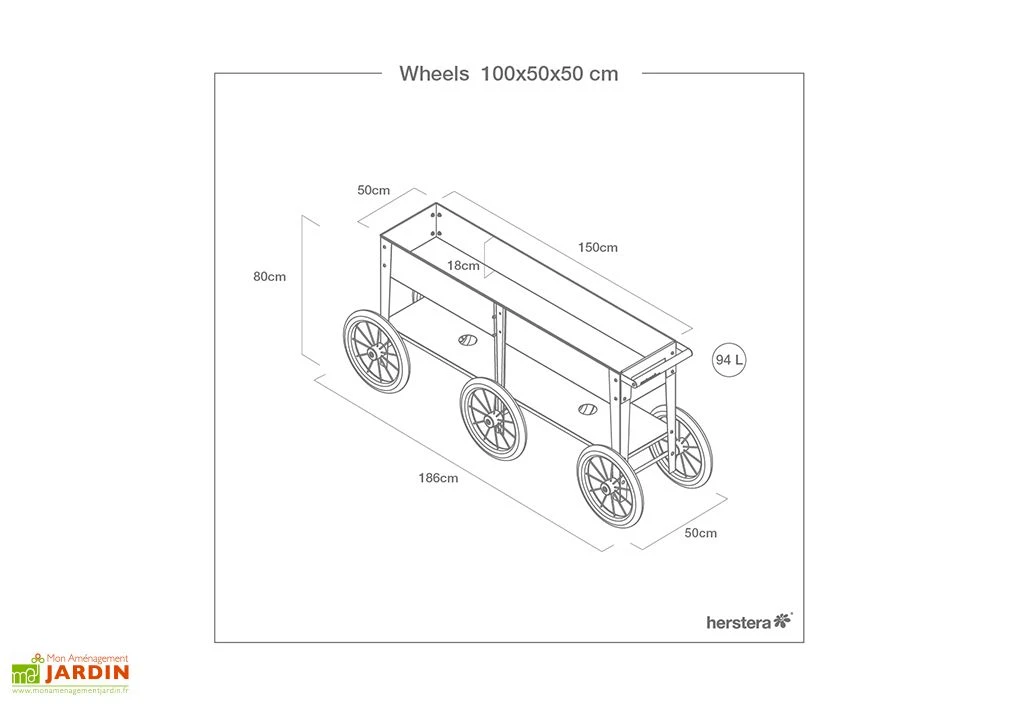 Ses dimensions sont de 150 x 35 x 80 cm (L, l, H). Sa hauteur vous permettra de jardiner sans vous faire mal au dos.