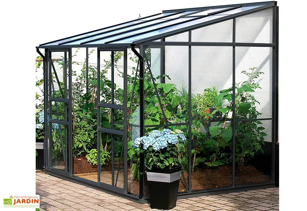 La serre adossée possède une structure en aluminium recouverte d’une laquage gris anthracite. L’aluminium est léger et les profils sont pré-percés pour faciliter le montage. Il résiste parfaitement à la corrosion et ne demande aucun entretien ni traitement. La visserie en inox est incluse. Elle est également insensible à la rouille.