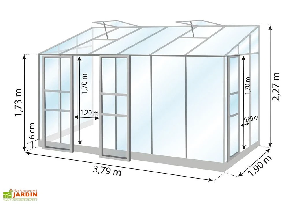 La serre de jardin adossée Melissa de Lams mesure 1,90 m de longueur, 3,79 m de largeur et 2,27 m de hauteur et offre une superficie au sol de 7,20 m² pour forcer vos semis et prolonger la récolte après la saison. Elle est à adosser à un mur déjà existant et trouve sa place sur la terrasse par exemple. Ses dimensions hors tout sont de 2,01 x 3,84 m.