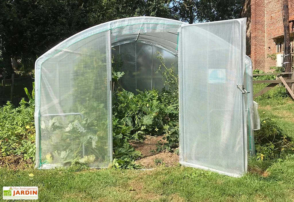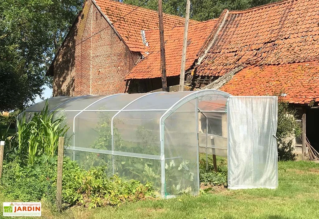La serre tunnel est fabriquée en France. Elle comprend une structure tubulaire en acier galvanisé de 30 mm de diamètre et de 1,5 mm d’épaisseur. Elle est recouverte d’une bâche en polyéthylène 200 microns transparente. Le pignon avant comprend une porte pivotante d’1 m de largeur. La façade avant comme la façade arrière sont en PVC armé 400 microns.