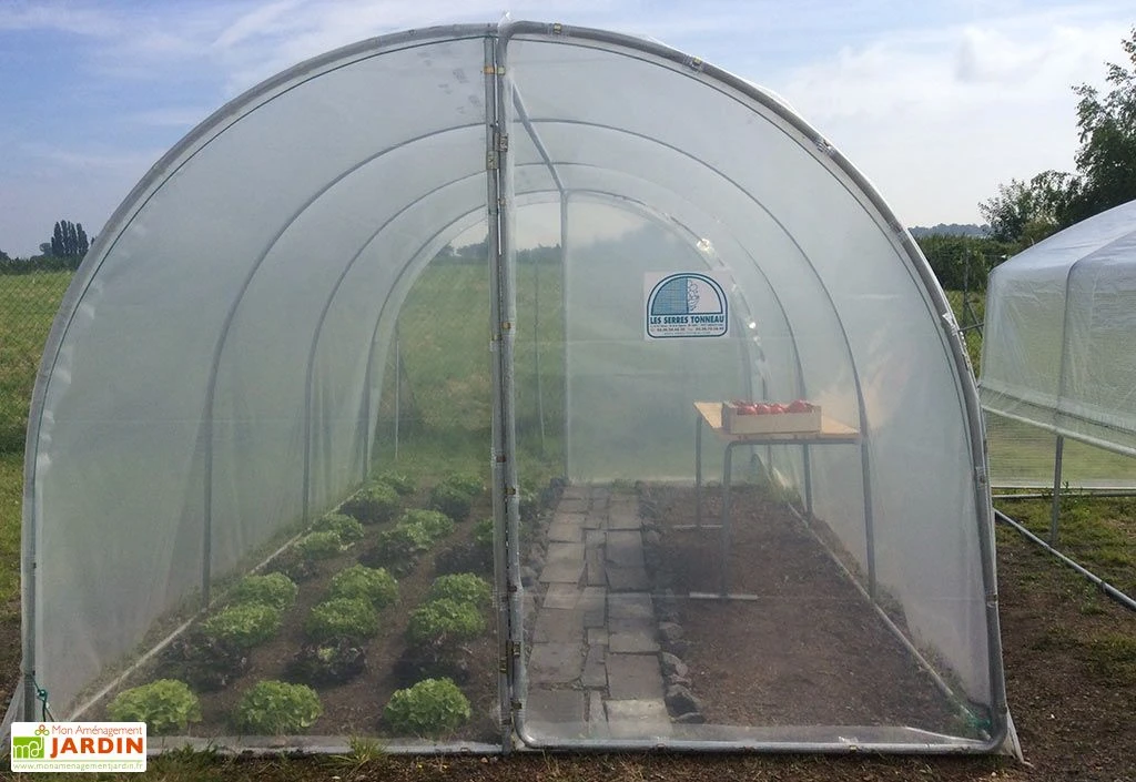 La serre Essentielle de Tonneau dispose d’une structure en tube d’acier galvanisé de 30 mm de diamètre et de 1,5 mm d’épaisseur. Elle est recouverte par une bâche en polyéthylène translucide de 200 microns non armé et traité anti-UV. La serre tunnel mesure 4,50 m de longueur, 3 m de largeur et 2,17 m de hauteur, au plus haut. Elle dispose de 2 portes pivotantes, une située à chaque extrémité. Lors du montage vous pouvez choisir le sens d’ouverture de la porte.